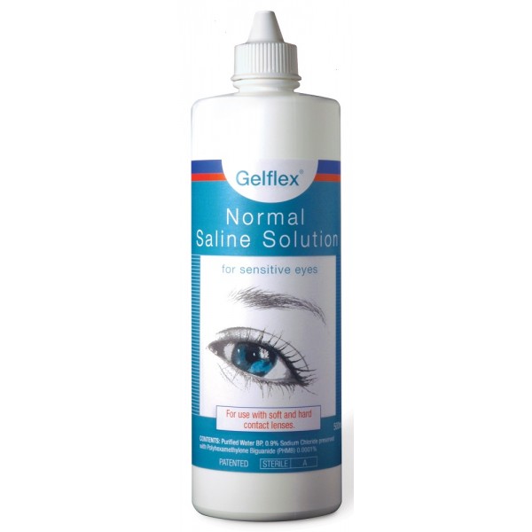 Gelflex® Normal Saline may be used as a rinsing solution for soft or hard contact lenses prior to disinfection by heat or liquid. Suitable for sensitive eyes.