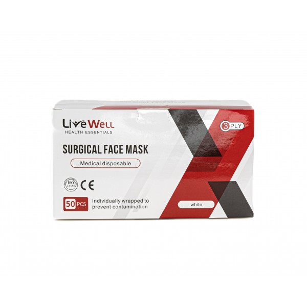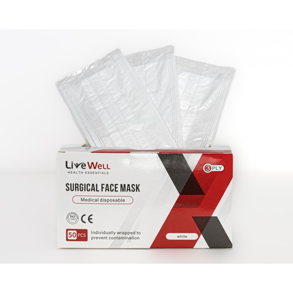 Live Well Health Essentials Surgical Face Masks come in a convenient box of 50 masks. They are individually wrapped and come in 2 colours.
